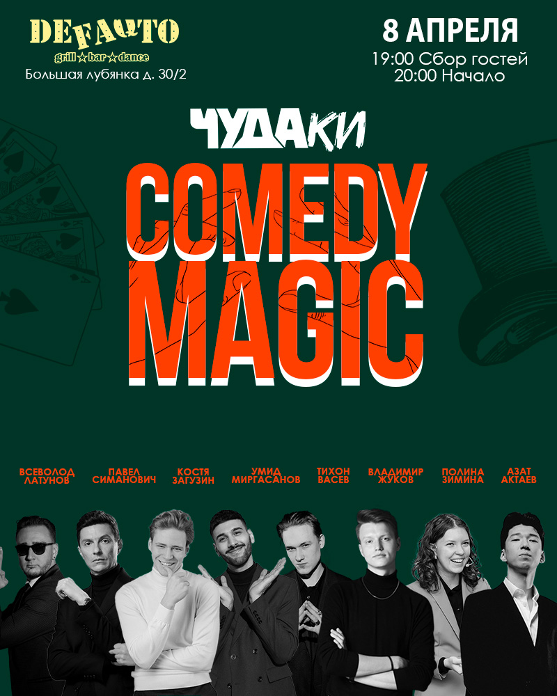 ЧУДАКИ Comedy magic - это самое смешное шоу фокусников в Москве. Состав Чуда’ков - профессиональные иллюзионисты, большие артисты жанра «Comedy Magic» И «Stand-Up Magic».